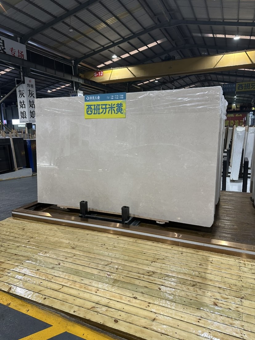 潤光石業(yè)長期大量供應(yīng)西班牙米黃,荒料5千噸,現(xiàn)貨1萬平以上,東升石材城1號通道B19區(qū),歡迎您的到來,18671467788。