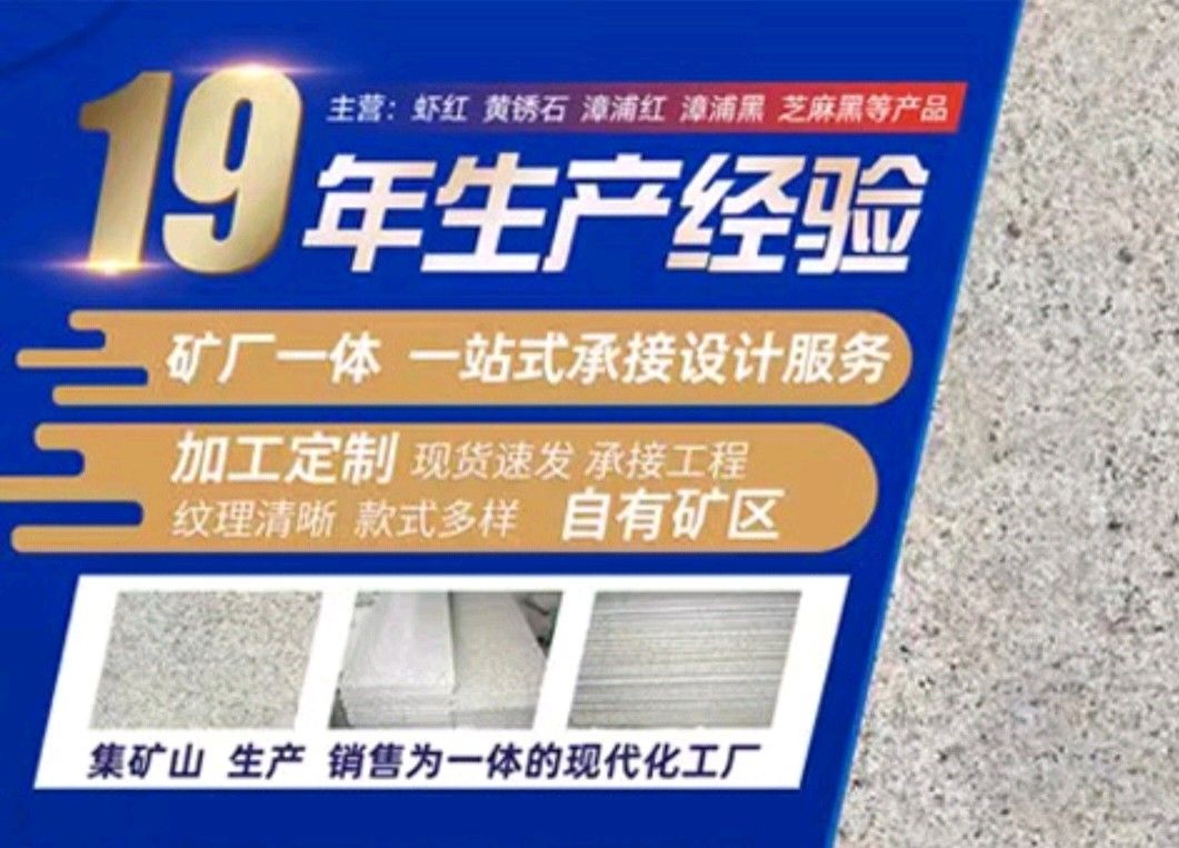 漳浦縣鴻勝石材有限公司是一家集礦山開采、自營加工生產(chǎn)、自主產(chǎn)供銷為一體的石業(yè)公司,公司擁有數(shù)家生產(chǎn)基地、手工加工場、大型礦山。公司創(chuàng)業(yè)歷程10年,憑著豐富的加工生產(chǎn)經(jīng)驗、雄厚的技術力量和先進的設備,產(chǎn)品遠銷歐美、韓國、新加坡、臺灣等地,深受客戶的信賴與好評。 本公司產(chǎn)品主要有: 漳浦紅,漳浦黑,漳浦青,漳浦蝦紅,漳浦銹石,福建青,安山巖,芝麻黑,芝麻灰,沙漠棕等。