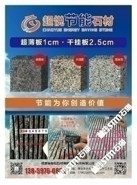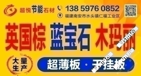 發(fā)布信息: 木瑪麗/藍寶石/英國棕(超薄板)吳總 13859760852手機微信同號-福建超悅石材薄板科技有限公司是一家專注于生產(chǎn)、研發(fā)花崗巖超薄板的研發(fā)型企業(yè),秉承“用創(chuàng)新的芯、做超薄的板、走節(jié)能的路”的發(fā)展理念,在多年來堅持不懈的努力下,成功地研發(fā)了擁有環(huán)保性能及高新技術(shù)的超薄板,其優(yōu)點可與國際薄板加工技術(shù)媲美。 花崗巖超薄板被廣泛應(yīng)用于復(fù)合板領(lǐng)域,包括保溫材料和鋁蜂窩等,是建筑外墻裝飾材料的。該產(chǎn)品降低了建筑成本、節(jié)約了裝飾 材料,縮短了施工周期,是當今社會廣為提倡和國家大力推廣的綠色、環(huán)保、節(jié)能建筑裝飾材料。 公司堅持奉行“創(chuàng)新永不止步,品質(zhì)始終如一”的經(jīng)營理念,爭創(chuàng)花崗巖超薄板領(lǐng)導品牌,將花崗巖超薄板做專做精做廣做強。