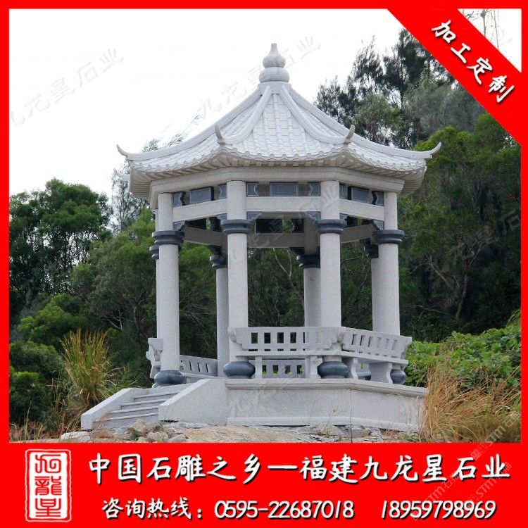 發(fā)布信息: 福建九龍星石業(yè)發(fā)展有限公司以“以誠為本、以質取信”。從事石雕行業(yè)二十多年,石雕涼亭款式多樣,有四角石涼亭、六角石亭子、八角石雕涼亭,價格合理。石雕涼亭材質可以為花崗巖、大理石等等,望廣大新老客戶前來參觀考察和選購(電話:18959798969)。 石雕亭子已經成為城市園林和自然山水增添美色的重要點綴建筑物。既增加了園林的情趣,又豐富了園林的景觀。 石雕亭子風姿獨具是特意為方便過往行人建筑的,山路從石雕涼亭中穿堂而過。園林石亭子的樣式,有四角的亭子、六角的亭子,八角形的亭子,扇形的亭子,還有雙層亭子和三層亭子之分。石雕涼亭在中國園林的意境中起到很重要的作用。